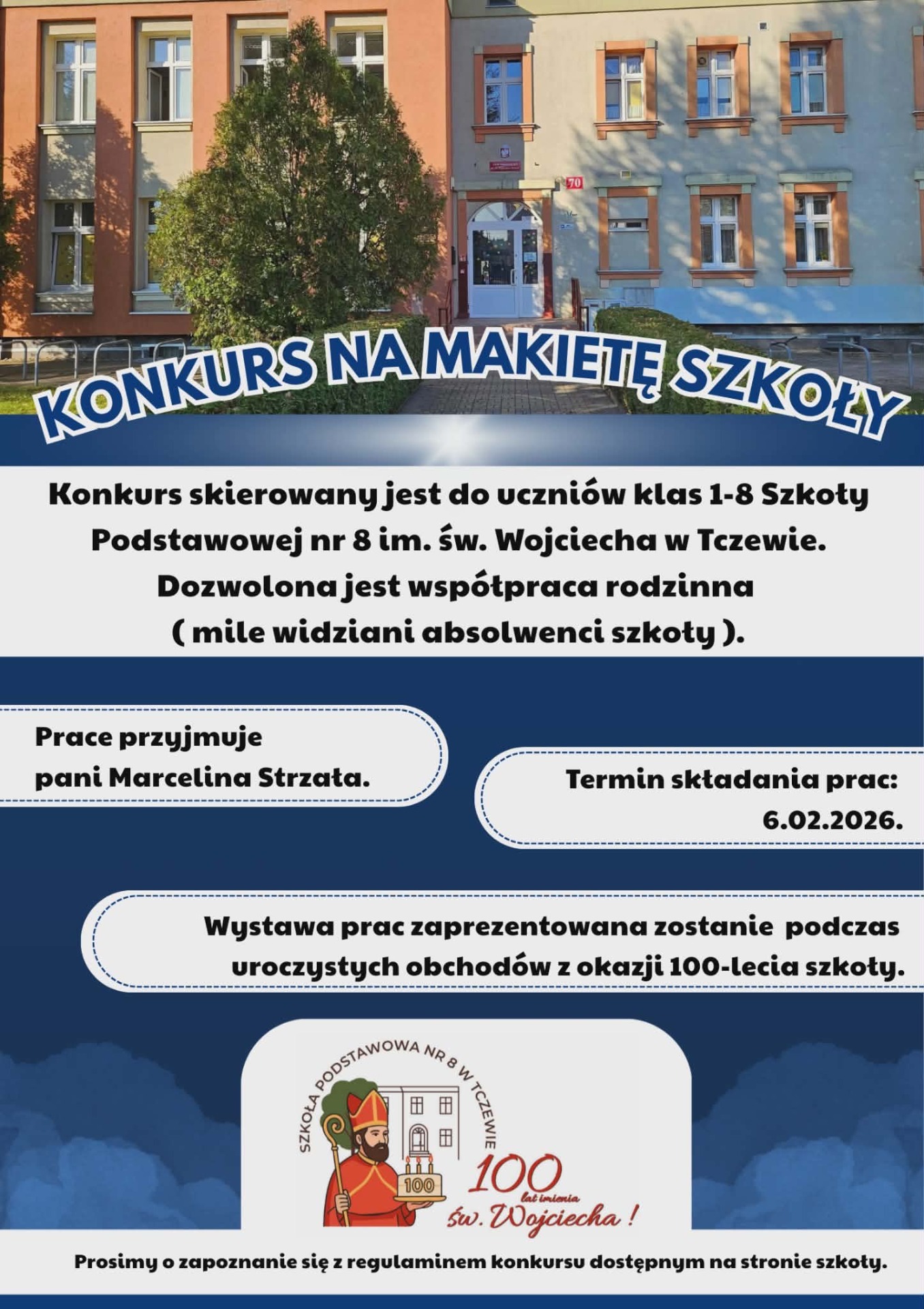 Z okazji 100-lecia nadania naszej szkole imienia św. Wojciecha zapraszamy uczniów klas 1 - 8 do udziału w wyjątkowym konkursie plastyczno-technicznym „Makieta szkoły”. Pokaż swoją kreatywność i stwórz przestrzenną miniaturę naszego budynku — samodzielnie albo wspólnie z rodziną (a nawet z absolwentami!).