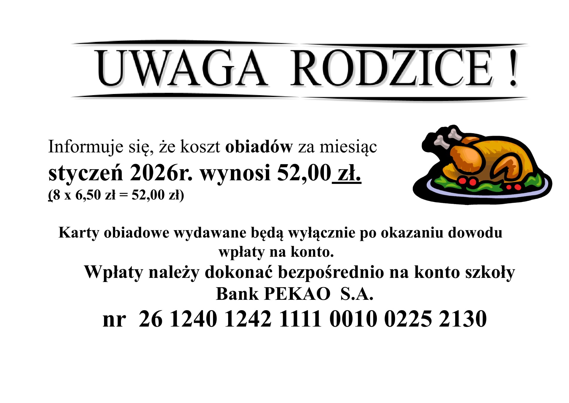 uprzejmie informujemy, że trwa przyjmowanie wpłat za obiady za miesiąc styczeń 2026 r.